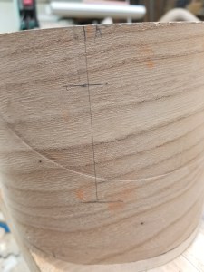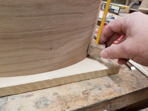 At this point you will need to place the lid in position and use the piece you just completed to mark where the holes will go to secure it, and where to put the grooves that the cords will ride in to allow it to rotate.
