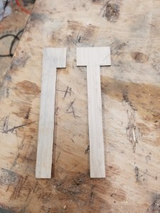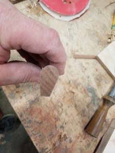 The second piece , the thinner of the two will be cut similar to the first except it will only have one of the arms of the t. This piece will then need to be worked so that the long narrow part is round. I start by removing the corners to make it an octagon and then sand from there. Once the lower portion of the piece is round you will round the back of the straight side. The right angle side can be left as is, or tapered to a wedge as personal preference dictates.